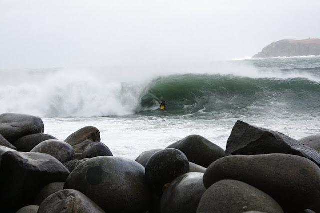 La cosa no pintaba bien y estábamos recogiendo todo para marcharnos, ya estando la gran mayoría en el coche con el cinturón puesto, entro una serie del oeste que nos demostró el potencial del spot que habiamos encontrado, dejándonos caer una buena bomba, hueca y muy seca. Tres de los riders salieron por patas del coche y sin pensárselo dos veces, ya estaba tirándose al agua por el primer saliente que encontraron.